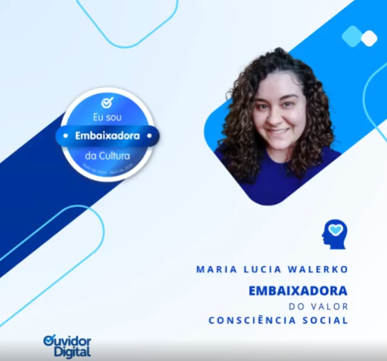 Campanha Institucional • 20/05/2024 Embaixadoras da Cultura Fui escolhida como Embaixadora de Consciência Social, um reconhecimento que reflete meu compromisso em apoiar a construção de organizações mais éticas e transparentes. Contribuo para criar um ambiente de trabalho positivo, alinhado com os objetivos estratégicos da organização, promovendo valores como respeito, empatia e o impacto responsável das nossas ações.